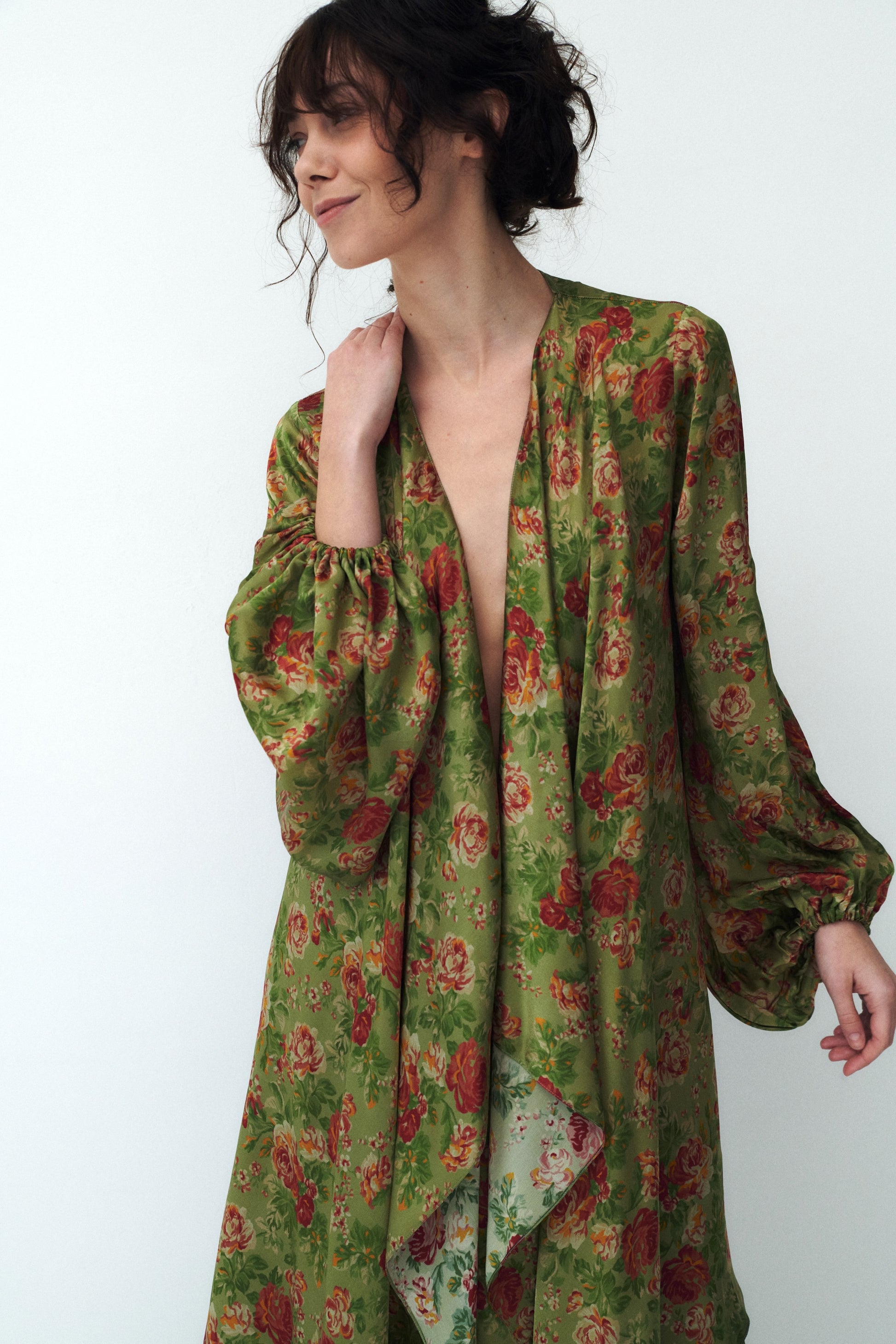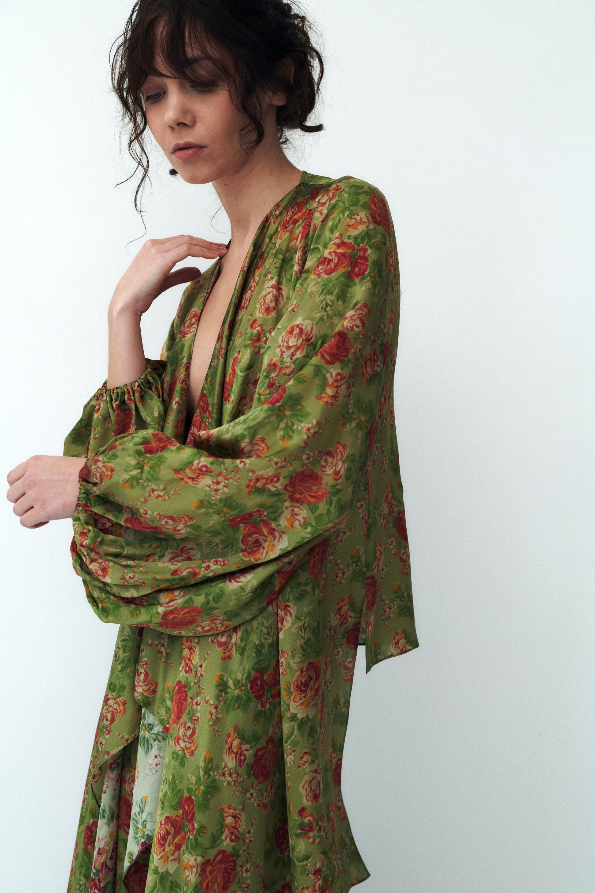 Skimming the edge between undone and divine, the voluminous balloon sleeves and low neckline of the Electrica blouse invites you to play with its open, sexy flowing form. Tie it in a soft front knot, leave it open if you dare to, or wrap it around the neck for a more sculpted, covered look. However you wear it, you’ll feel electric.
